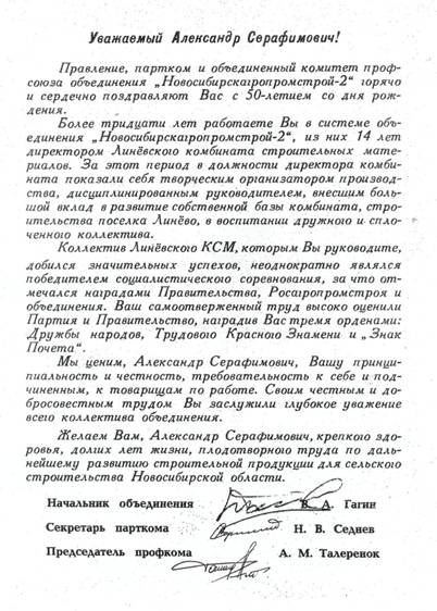 Отдавая всего себя комбинату, Александр Серафимович этого же ждал и от рабочих комбината. И люди платили ему доверием и уважением. Под его руководством комбинат добивался высоких производственных показателей, неоднократно становился победителем социалистического соревнования среди строительных организаций Новосибирской области и всей страны.
